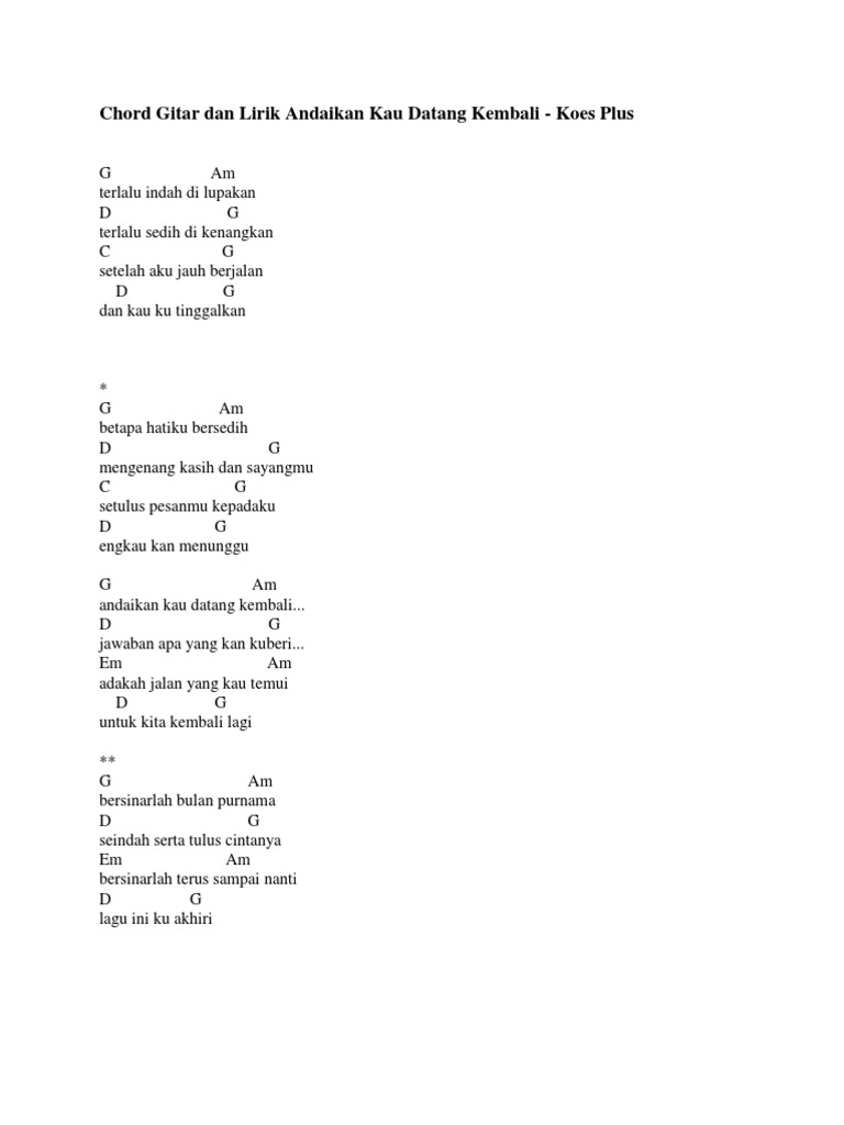 . Yakni lagu Andaikan Kau Datang milik Koes Plus dan langsung viral di media sosial. Hallo guys di video kali ni aku membagikan kunci gitar andaikan kau datang kembali lagu dari band legendaris Koes plussemoga teman teman paham apa yang saya. Am D G C Bm Em Gm Chords for Andaikan Kau Datang Kembali - KoesPlus Noah Felix Cover with song key BPM capo transposer play along with guitar piano ukulele mandolin.